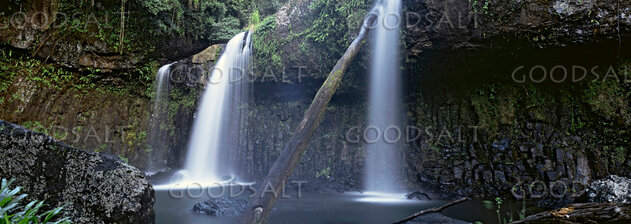 twin waterfalls in tropical forest by Mal Austin