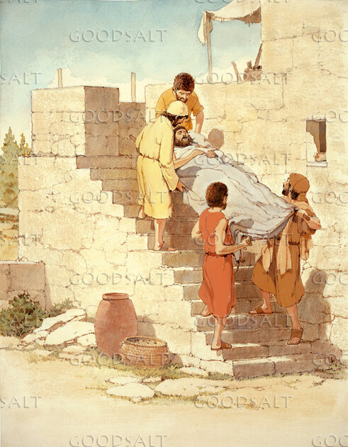 Because the crowd stopped them, four friends are carrying their sick friend up the steps to get to the roof of the house where Jesus is inside. They want Jesus to heal their sick friend. by Lifeway Collection