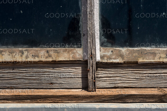 Detail old window frame with cracked hardwood and corrugated iron surrounds. by Mal Austin