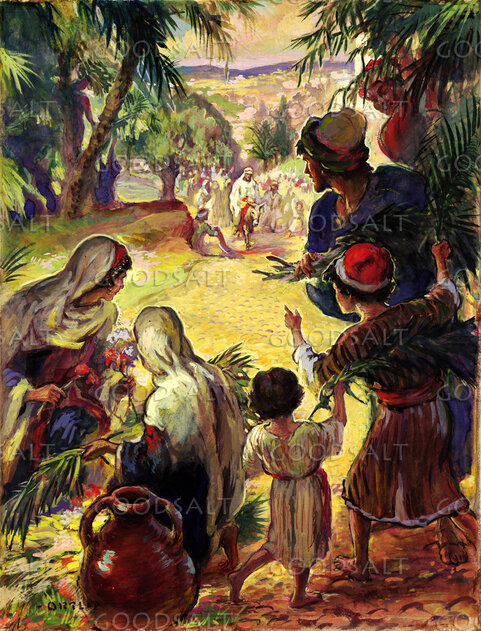 John 1212 The next day the large crowd that had come to the feast heard that Jesus was coming to Jerusalem.13 So they took branches of palm trees and went out to meet him, crying out, “Hosanna! Blessed is he who comes in the name of the Lord, even the King of Israel!”14 And Jesus found a young donkey and sat on it, just as it is written,15 “Fear not, daughter of Zion; behold, your king is coming, sitting on a donkey's colt!”16 His disciples did not understand these things at first, but when Jesus was glorified, then they remembered that these things had been written about him and had been done to him.17 The crowd that had been with him when he called Lazarus out of the tomb and raised him from the dead continued to bear witness.18 The reason why the crowd went to meet him was that they heard he had done this sign.19 So the Pharisees said to one another, “You see that you are gaining nothing. Look, the world has gone after him.” Luke 1928 And when he had said these things, he went on ahead, going up to Jerusalem.29 When he drew near to Bethphage and Bethany, at the mount that is called Olivet, he sent two of the disciples,30 saying, “Go into the village in front of you, where on entering you will find a colt tied, on which no one has ever yet sat. Untie it and bring it here.31 If anyone asks you, ‘Why are you untying it?’ you shall say this: ‘The Lord has need of it.’”32 So those who were sent went away and found it just as he had told them.33 And as they were untying the colt, its owners said to them, “Why are you untying the colt?”34 And they said, “The Lord has need of it.”35 And they brought it to Jesus, and throwing their cloaks on the colt, they set Jesus on it.36 And as he rode along, they spread their cloaks on the road.37 As he was drawing near—already on the way down the Mount of Olives—the whole multitude of his disciples began to rejoice and praise God with a loud voice for all the mighty works that they had seen,38 saying, “Blessed is the King who comes in the name of the Lord! Peace in heaven and glory in the highest!”39 And some of the Pharisees in the crowd said to him, “Teacher, rebuke your disciples.”40 He answered, “I tell you, if these were silent, the very stones would cry out.”41 And when he drew near and saw the city, he wept over it,42 saying, “Would that you, even you, had known on this day the things that make for peace! But now they are hidden from your eyes.43 For the days will come upon you, when your enemies will set up a barricade around you and surround you and hem you in on every side44 and tear you down to the ground, you and your children within you. And they will not leave one stone upon another in you, because you did not know the time of your visitation.” Mark 111 Now when they drew near to Jerusalem, to Bethphage and Bethany, at the Mount of Olives, Jesus sent two of his disciples2 and said to them, “Go into the village in front of you, and immediately as you enter it you will find a colt tied, on which no one has ever sat. Untie it and bring it.3 If anyone says to you, ‘Why are you doing this?’ say, ‘The Lord has need of it and will send it back here immediately.’”4 And they went away and found a colt tied at a door outside in the street, and they untied it.5 And some of those standing there said to them, “What are you doing, untying the colt?”6 And they told them what Jesus had said, and they let them go.7 And they brought the colt to Jesus and threw their cloaks on it, and he sat on it.8 And many spread their cloaks on the road, and others spread leafy branches that they had cut from the fields.9 And those who went before and those who followed were shouting, “Hosanna! Blessed is he who comes in the name of the Lord!10 Blessed is the coming kingdom of our father David! Hosanna in the highest!”11 And he entered Jerusalem and went into the temple. And when he had looked around at everything, as it was already late, he went out to Bethany with the twelve. Matthew 211 Now when they drew near to Jerusalem and came to Bethphage, to the Mount of Olives, then Jesus sent two disciples,2 saying to them, “Go into the village in front of you, and immediately you will find a donkey tied, and a colt with her. Untie them and bring them to me.3 If anyone says anything to you, you shall say, ‘The Lord needs them,’ and he will send them at once.”4 This took place to fulfill what was spoken by the prophet, saying,5 “Say to the daughter of Zion, ‘Behold, your king is coming to you, humble, and mounted on a donkey, and on a colt, the foal of a beast of burden.’”6 The disciples went and did as Jesus had directed them.7 They brought the donkey and the colt and put on them their cloaks, and he sat on them.8 Most of the crowd spread their cloaks on the road, and others cut branches from the trees and spread them on the road.9 And the crowds that went before him and that followed him were shouting, “Hosanna to the Son of David! Blessed is he who comes in the name of the Lord! Hosanna in the highest!”10 And when he entered Jerusalem, the whole city was stirred up, saying, “Who is this?”11 And the crowds said, “This is the prophet Jesus, from Nazareth of Galilee.” | |