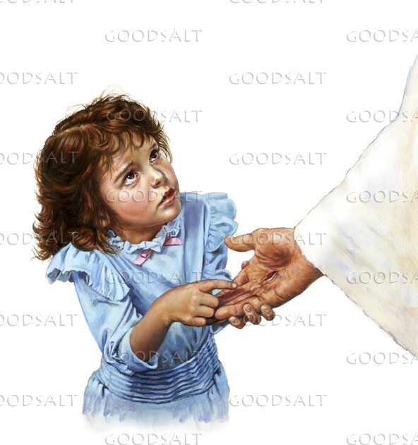 Young girl asks Jesus "What happened to your hand"? by Lars Justinen