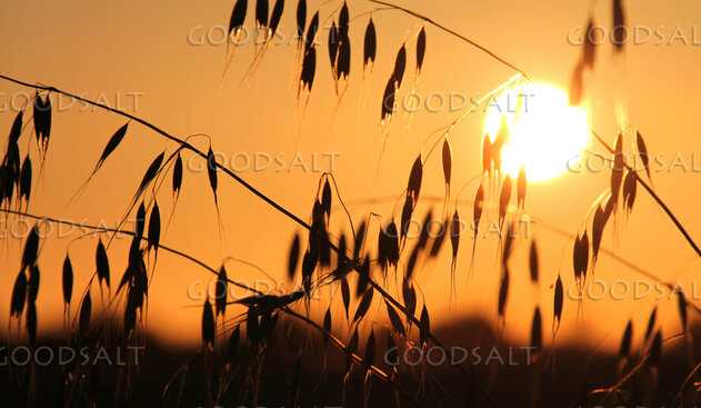 Wild oats in silhouette at sunset, with the sun a large golden ball by John Baker