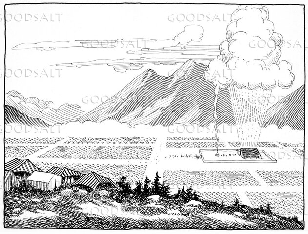 Black and white ink line art of the camp in the wilderness with the sanctuary, the cloud, Mount Sinai, and tents. by Review & Herald Publishing