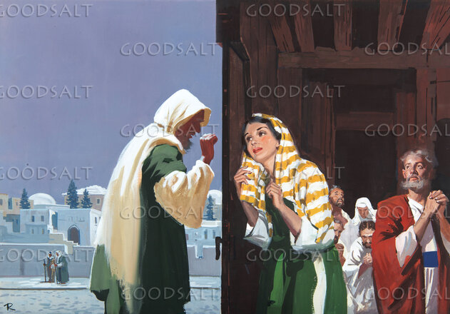 Peter knocks on Mary's, mother of John Mark, door and Rhoda lets him in. Many disciple were there, praying for him. The Lord had helped him to escape. by Review & Herald Publishing