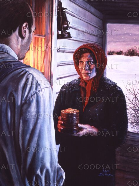 Woman giving humble Christmas pudding to man in gratitude for help to her family. by Lars Justinen