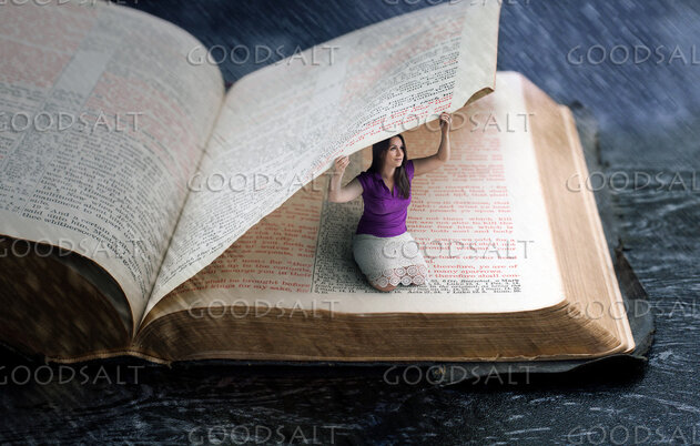 A woman hiding under the pages of the Bible. by Kevin Carden