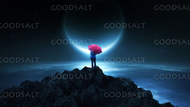 A woman with an umbrella on a tall mountain by Kevin Carden