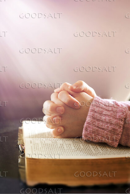 Two hands of a woman in prayer over the Bible by Kevin Carden