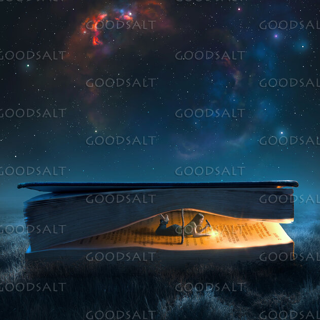 A woman in a large book reads by flashlight under a night sky by Kevin Carden