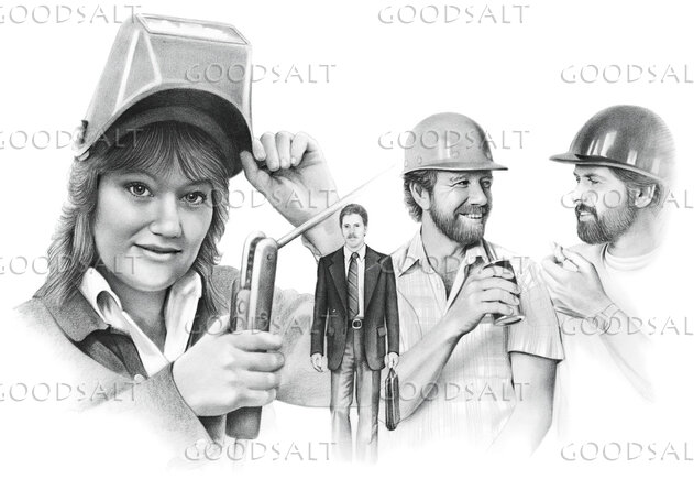 Women dones arc welders gear with three different kinds of men workers in background by Darrel Tank
