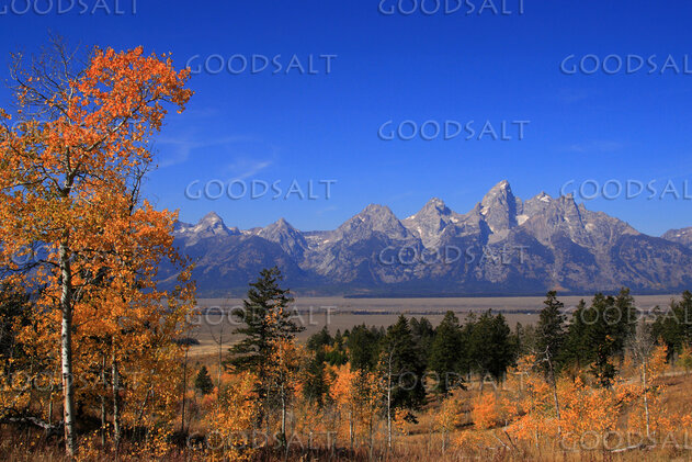 WYOMING. Teton National Park. Golden aspens framing Teton mo