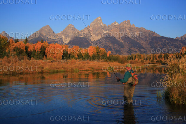 6. WYOMING. Teton National Park. Man fly fishing at Schwabacher