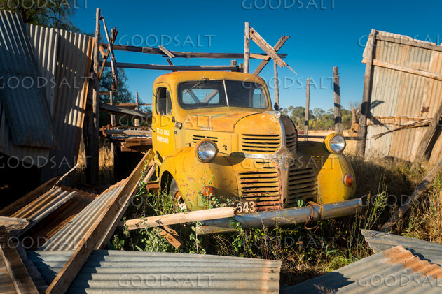 Yellow Dodge tray truck with remains of its shed fallen down around it. by Mal Austin