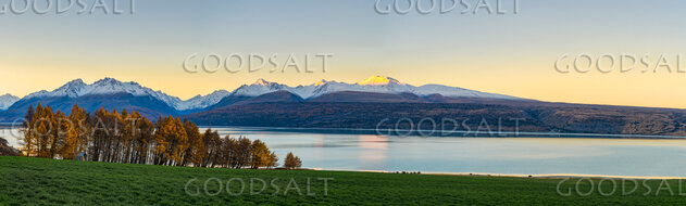 Alpine mountains catch the very last of the yellow light behind a green field and row of coloured Larch. by Mal Austin