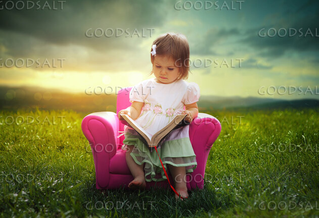 A young girl reads a Bible in a chair outside. by Kevin Carden