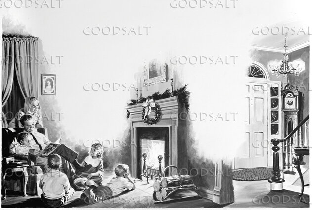 A father reads a story to his children at Christmas before a fireplace. Vintage drawing by IDEALS Collections