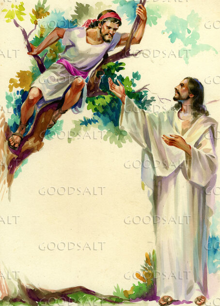 Luke 191 He entered Jericho and was passing through.2 And there was a man named Zacchaeus. He was a chief tax collector and was rich.3 And he was seeking to see who Jesus was, but on account of the crowd he could not, because he was small of stature.4 So he ran on ahead and climbed up into a sycamore tree to see him, for he was about to pass that way.5 And when Jesus came to the place, he looked up and said to him, “Zacchaeus, hurry and come down, for I must stay at your house today.”6 So he hurried and came down and received him joyfully.7 And when they saw it, they all grumbled, “He has gone in to be the guest of a man who is a sinner.”8 And Zacchaeus stood and said to the Lord, “Behold, Lord, the half of my goods I give to the poor. And if I have defrauded anyone of anything, I restore it fourfold.”9 And Jesus said to him, “Today salvation has come to this house, since he also is a son of Abraham.10 For the Son of Man came to seek and to save the lost.” | |