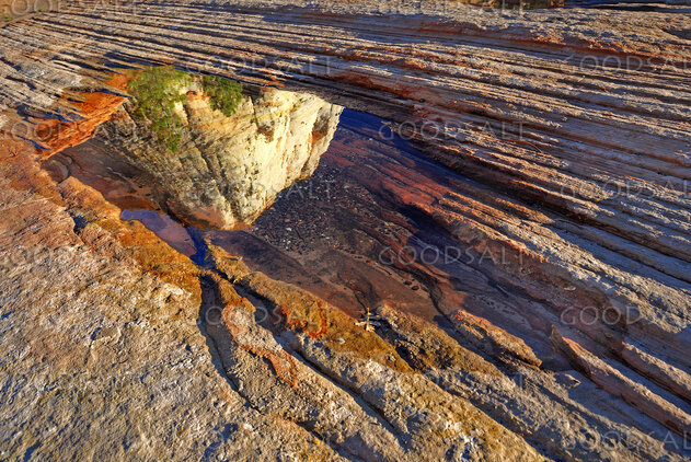 5. Reflection with trees and steep rock mountain peak in farm dam.